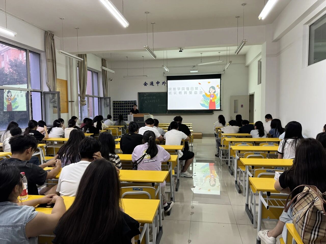 为进一步强化学风建设、激发同学们的学习热情,我院于2025年9月7日在信育楼召开了“续推学风强日常 抓实教育聚奋进”主题班会。会议由学工办主任高艳华老师和团委书记兼辅导员付明明老师共同主持,全院学生参加。